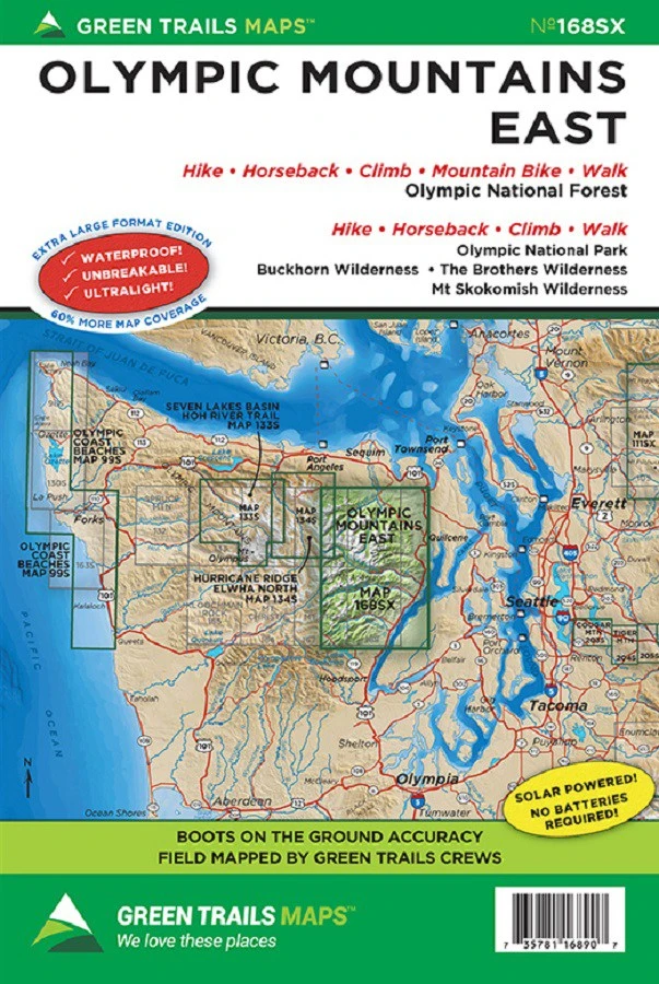 With 60% more coverage in rich topographic detail, the Green Trails Olympic Mountains East map (168SX) is your boots-on-the-ground guide to the wilderness of the east side of the Olympic Peninsula.