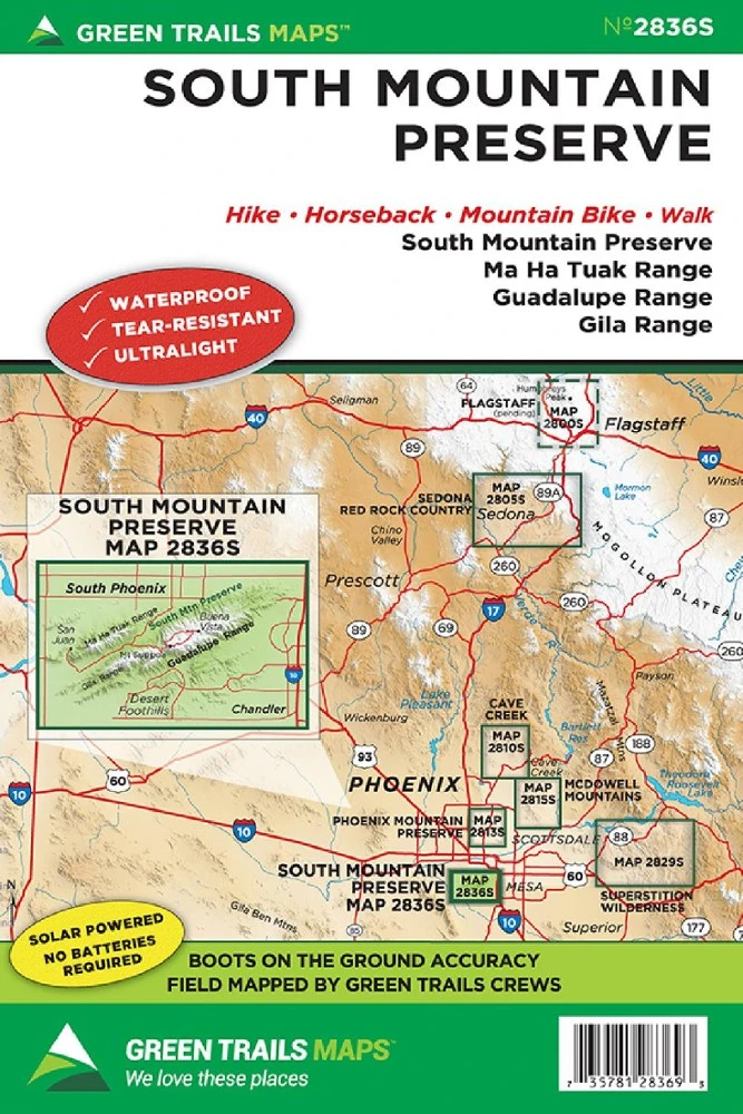 Centered around the Guadalupe Range, the Green Trails South Mountain Preserve map (2836S) offers a beautifully detailed topographic guide to one of the largest city parks in the U.S.