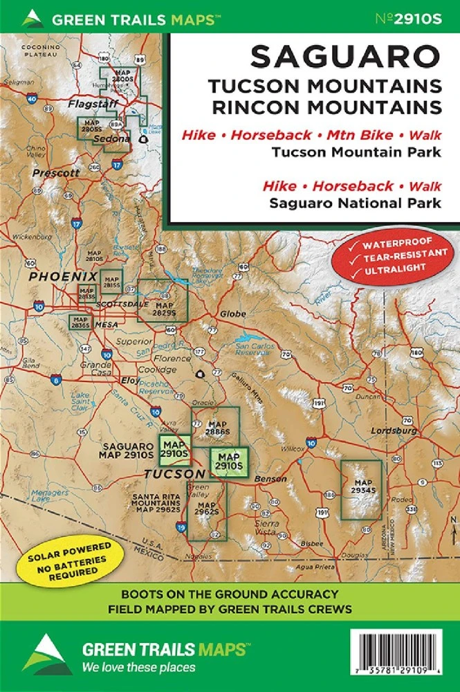 Including both Tucson Mountain Park and Saguaro National Park, the Green Trails Saguaro map (2910S) offers a beautifully detailed topographic guide for outdoor recreation near Tucson, Arizona.