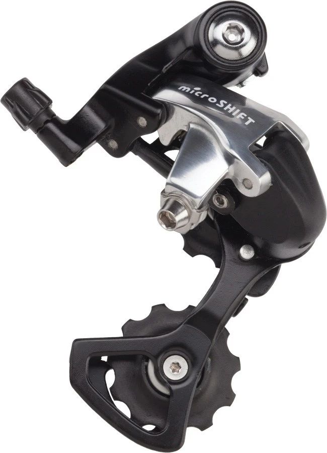 Designed for bikes with double cranksets, this short-cage microSHIFT R9 9-speed rear derailleur keeps weight low and performance high with a design that marries form and function.